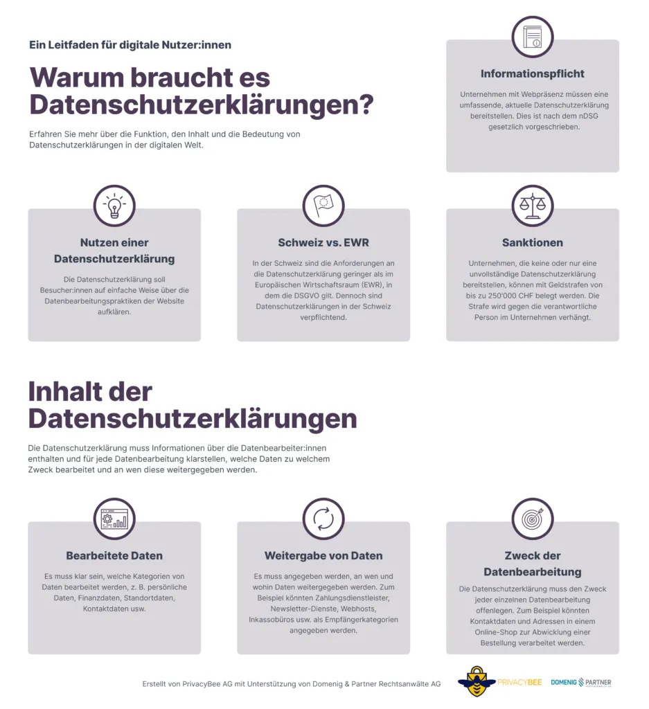 PrivacyBee ist ein Datenschutz-Tool, das Datenschutzerklärungen schnell, einfach und kosteneffizient erstellt und aktualisiert. Es unterstützt bei der Einhaltung des neuen Schweizer Datenschutzgesetzes (nDSG), überprüft regelmässig Websites auf Datenschutzdienste und ist mit allen CMS für Websites kompatibel. PrivacyBee bietet mehrsprachige, anwaltlich geprüfte und stets aktuelle Datenschutzhinweise – ein echter Zeit- und Geldsparer.